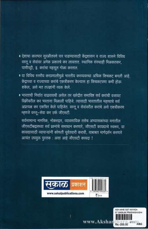 सर्वसामान्य नागरिक, नोकरदार, व्यावसायिक तसेच अभ्यासकांच्या मनातील जीएसटीबद्दलच सर्व प्रश्नांचे समाधन करणारे, जीएसटी कायद्याचे स्वरुप, या कायद्यासाठी व्यापार्यांनी कोणती पूर्वतयारी करावी, याबाबत मार्गदर्शन करणारे अत्यंत उपयुक्त पुस्तक : असा आहे जीएसटी कायदा ! देशाचा कारभार सुरळीतपणे पार पाडण्यासाठी केंद्रशासन व राज्य शासने विविध वस्तू व सेवांवर अनेक प्रकारचे कर लावतात. स्थानिक संस्थाही मिळकतकर, पाणीपट्टी, इ. करांचा महसूल गोळा करतात. या विविध स्तरीय करप्रणालीमुळे भारतीय करव्यवस्था अधिक किचकट बनली आहे. केंद्राच्या व राज्याच्या करांचे एकत्रीकरण केल्यास हा किचकटपणा कमी होऊ शकेल, असे मत तज्ज्ञांनी व्यक्त केले. Marathi Book On GST