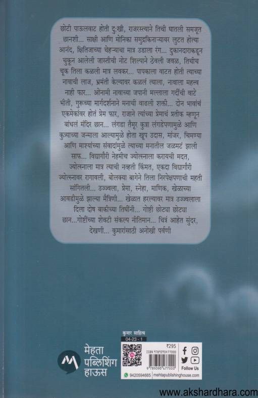 छोटी पाऊलवाट होती दु:खी, राजरस्त्याने तिची घातली समजूत छानशी.. साक्षी आणि मोनिका समुद्रकिनार्यावर लुटत होत्या आनंद, क्षितिजाच्या चेहर्याचा मात्र उडाला रंग.... दुकानदाराकडून चुकून आलेली जास्तीची नोट शिल्पाने ठेवली जवळ, तिचीच चूक तिला कळली मात्र लवकर... पापकाला वाटत होती त्याच्या नावाची लाज, भ्रमंती केल्यावर कळलं त्याला, नावाला महत्त्व नाही फार... ओनामी नावाच्या जपानी मल्लाला गर्दीची वाटे भीती, गुरूच्या मार्गदर्शनाने मनाची वाढली शक्ती... दोन भावांचं एकमेकांवर होतं प्रेम फार, राजाने त्यांच्या प्रेमाचं प्रतीक म्हणून बांधलं मंदिर छान... लंगडा तैमुर कुत्रा लंगडेपणामुळे आणि कुत्र्याच्या जन्माला आल्यामुळे होता खूप उदास, मांजर, चिमण्या आणि माश्यांच्या संवादांमुळे त्याच्या मनातील जळमटं झाली साफ... विद्यागौरी नेहमीच ज्योत्स्नाला करायची मदत, ज्योत्स्नाला मात्र त्याची नव्हती किंमत, एकदा विद्यागौरी ज्योत्स्नावर रागावली, बोलक्या बागेने तिला निरपेक्षपणाची महती सांगितली... उज्ज्वला, प्रेमा, स्नेहा, माणिक, खेळाच्या आवडीमुळे झाल्या मैत्रिणी... खेळात हरल्यावर मात्र उज्ज्वलाला दिला दोष बाकीच्या तिघींनी...गोष्टी छोट्या छोट्या छान.. गोष्टींच्या शेवटी संकल्प नीतिमान.. चित्रं आहेत सुंदर, देखणी.. कुमारांसाठी अनोखी पर्वणी