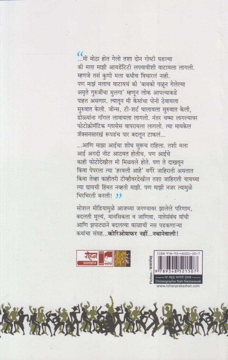 ' ....मी मोठा होत गेलो तशा दोन गोष्टी घडल्या की मला माझी आयडेंटिटी लपवावीशी वाटायला लागली. म्हणजे तसं कुणी मला कधीच विचारलं नाही. पण माझं मलाच वाटायचं की 'बायको पळून गेलेल्या अमृते गुरुजींचा मुलगा' म्हणून लोक आपल्याकडे पाहत असणार. त्यातून मी केसांचा पोनी ठेवायला सुरुवात केली. जीन्स, टी-शर्ट घालायला सुरुवात केली, डोळ्यांना गॉगल लावायला लागलो. नंतर चष्मा लागल्यावर फोटोक्रोमॅटिक ग्लासेस वापरायला लागलो. त्या मायकेल जॅक्सनसारखं रूपडंच पार बदलून टाकलं... ...आणि माझा आईचा शोध सुरूच राहिला. तशी मला आई अगदी नीट आठवत होतीच, पण आईचे काही फोटोदेखील मी मिळवले होते. पण ते दाखवून किंवा पेपरला त्या 'हरवली आहे' वगैरे जाहिराती असतात किंवा तेव्हा काहीतरी टीव्हीवरदेखील तशा जाहिराती यायच्या त्या द्यायची हिंमत नव्हती माझी. पण माझी नजर त्यामुळे भिरभिरती बनली!" सोशल मीडियामुळे आजच्या जगण्यावर झालेले परिणाम, बदलती मूल्यं, मानसिकता व जाणिवा, नातेसंबंध यांची आणि झपाट्याने बदलत्या काळाची नस पडकणाऱ्या कथांचा संग्रह... कोरिओग्राफर नहीं... नचानेवाली !'