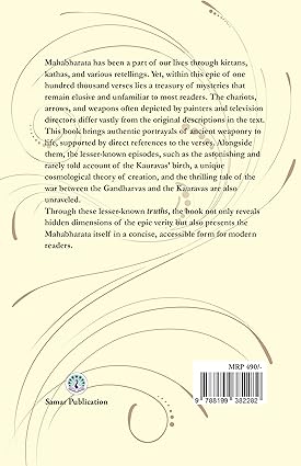 Mahabharata has been a part of our lives through kirtans, kathas, and various retellings. Yet, within this epic of one hundred thousand verses lies a treasury of mysteries that remain elusive and unfamiliar to most readers. The chariots, arrows, and weapons often depicted by painters and television directors differ vastly from the original descriptions in the text. This book brings authentic portrayals of ancient weaponry to life, supported by direct references to the verses. Alongside them, the lesser-known episodes, such as the astonishing and rarely told account of the Kauravas’ birth, a unique cosmological theory of creation, and the thrilling tale of the war between the Gandharvas and the Kauravas are also unraveled. Through these lesser-known truths, the book not only reveals hidden dimensions of the epic verity but also presents the Mahabharata itself in a concise, accessible form for modern readers.