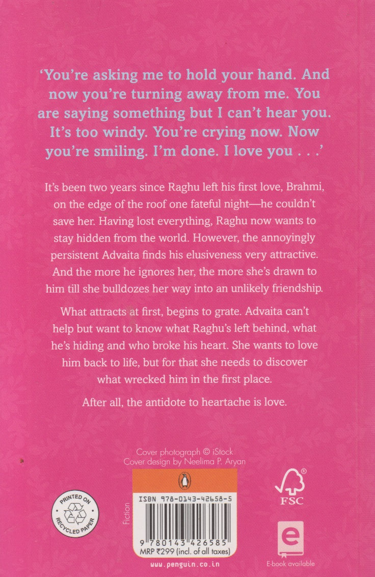 'You're asking me to hold your hand. And now you're turning away from me. You are saying something but I can't hear you. It's too windy. You're crying now. Now you're smiling. I'm done. I love you...' It's been two years since Raghu left his first love, Brahmi, on the edge of the roof one fateful night-he couldn't save her. Having lost everything, Raghu now wants to stay hidden from the world. However, the annoyingly persistent Advaita finds his elusiveness very attractive. And the more he ignores her, the more she's drawn to him till she bulldozes her way into an unlikely friendship. What attracts at first, begins to grate. Advaita can't help but want to know what Raghu's left behind, what he's hiding and who broke his heart. She wants to love him back to life, but for that she needs to discover what wrecked him in the first place. After all, the antidote to heartache is love.